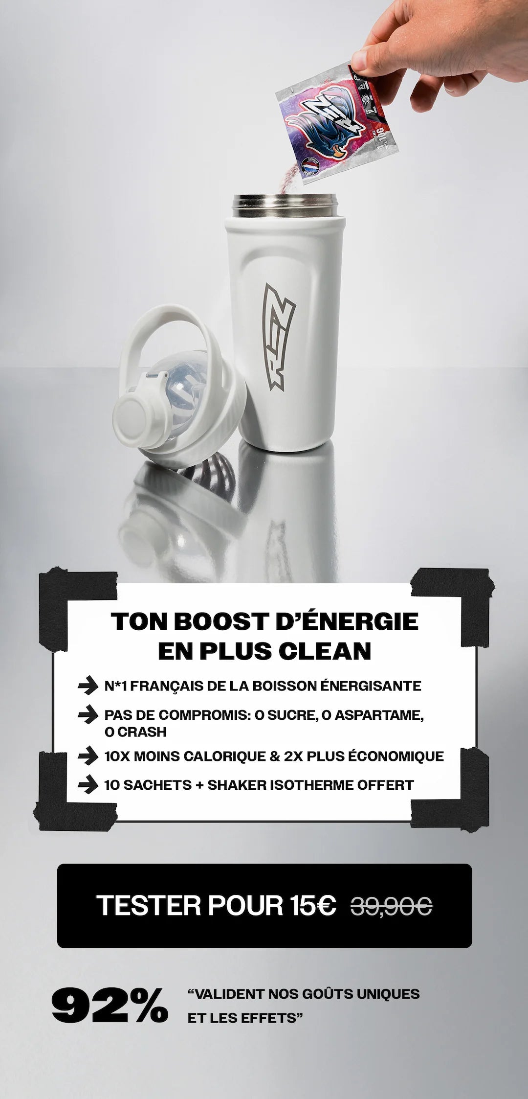 Rez® vient du gaming : “rez me”, “ressuscite-moi”. Ce n’est pas un hasard : on a traversé le chaos, et on en est sortis plus forts. Comme le phénix sur nos packagings, symbole de renaissance : rien n’est jamais mort. On avance avec une énergie brute, celle qu’il y a dans chaque shaker de Rez®, pour exploser tes limites.