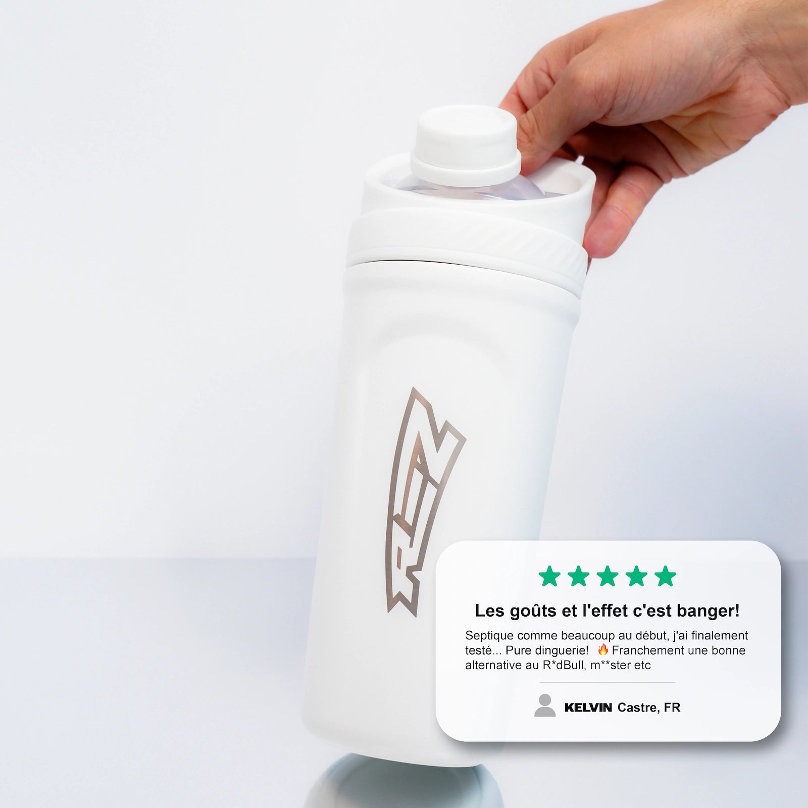 Remplis ton shaker Rez avec 300 à 500 ml d’eau bien fraîche, ajoute un sachet ou une dosette et secoue intensément quelques secondes.
